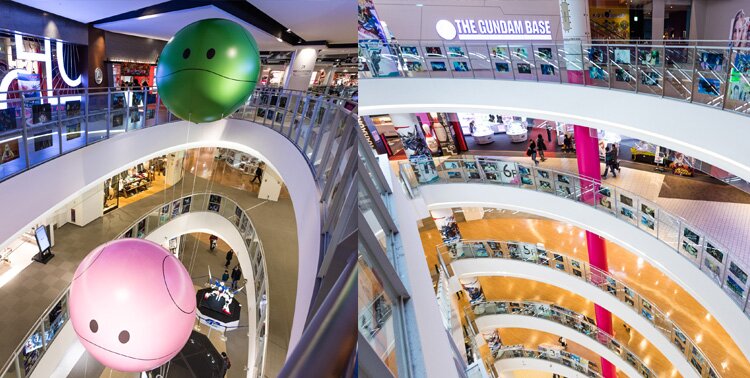 館内の柱やエントランス、吹き抜けガラス、エレベーターなど、いたるところにガンダムデザインの展示やラッピングが施されるほか、1階、3階、4階、5階の各フロアにはシリーズに合わせた1/10ガンダム立像を展示!4階においてはガンダム関連グッズも展示!さらに4階~6階の吹き抜けスペースには約2mの巨大なハロバルーンも登場します!